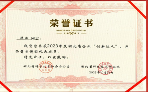 張浩同志榮獲2023年湖北省企業“創新達人”稱號